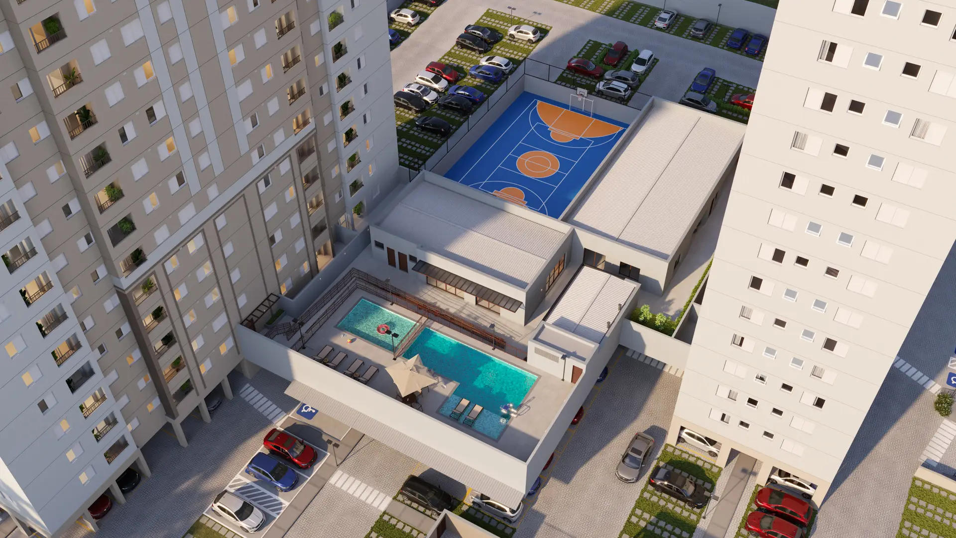 Clube no pavimento elevado com piscinas adulto e infantil, fitness, quadra recreativa, salão de festas, churrasqueiras, salão de jogos e espaço kids.